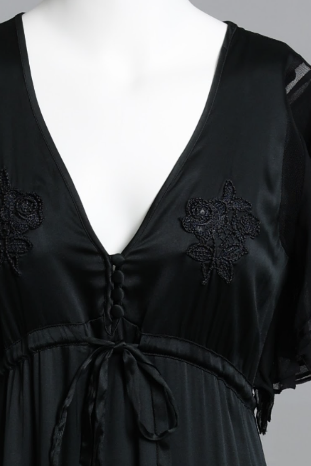 Our top choice of the season is this Black Silk Embroidered Floral Dress, which exudes timeless charm and subtle sexiness. Made from a silk blend fabric, this dress is adorned with exquisite embroidered floral detailing, a flattering V-neckline, and delicate ruffle accents.