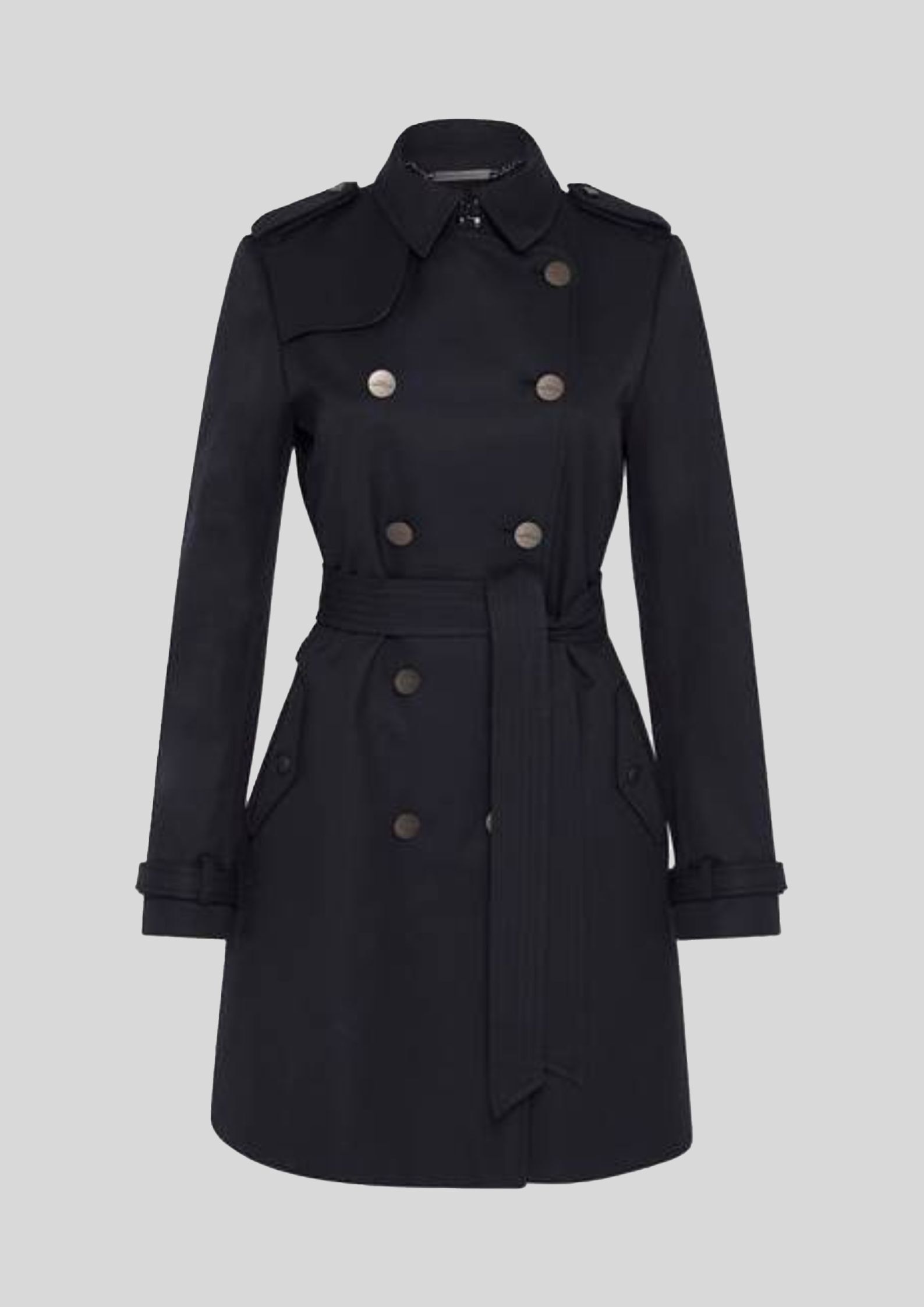 The Devon Trench Coat from David Lawrence is a timeless piece that's perfect for the fall and winter seasons. It has a longline design and a slim fit, and features eye-catching shoulder epaulettes, gunmetal hardware with a matte finish, and a self-fabric belt. The coat is elegantly finished with a storm flap and pockets.