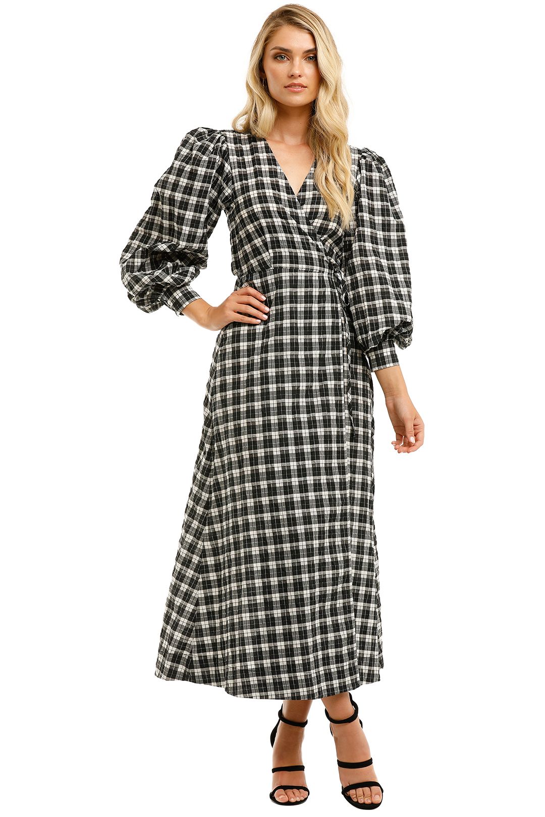 Look feminine and feel chic this season in this check print dress by Ganni. This midi-length dress is a wrap style with a v-neckline and long blouson sleeves with a slightly gathered shoulder. Perfect for your next luncheon