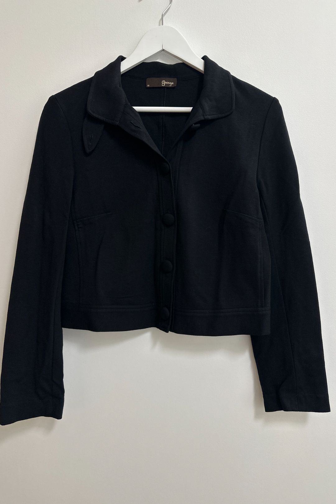 George presents a figure-flattering jacket made from stretchy fabric, designed to snugly hug the waist. The secure fit is ensured by a button closure. Featuring long sleeves and a classic collared neckline, this elegant garment is adorned with covered buttons, adding a refined and polished finish to its overall style.