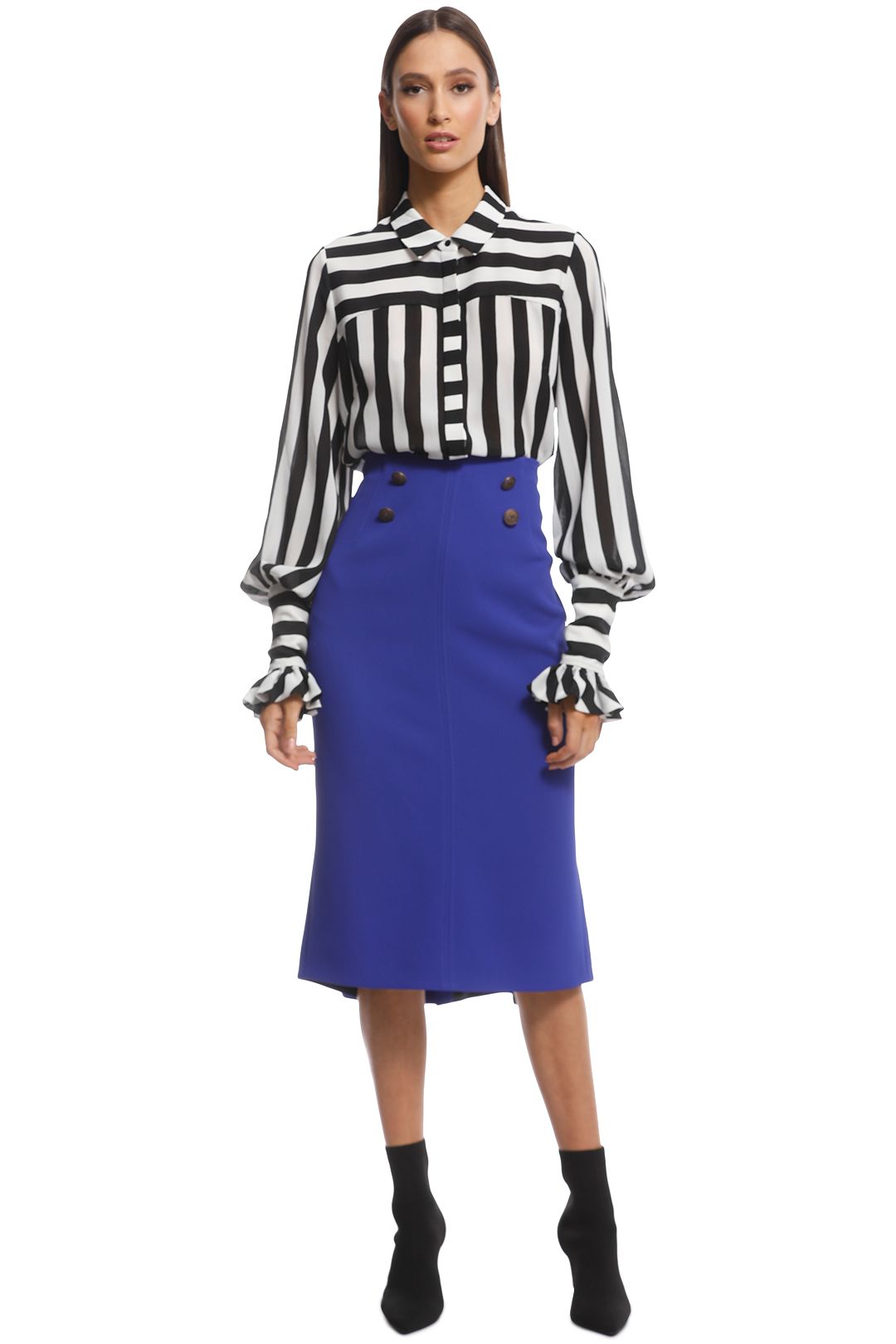 A modern and stylish update on the classic pencil skirt, the Suffuse Skirt by Ginger and Smart is a must-rent for work functions and date nights! A versatile skirt that you can dress up or down, the cobalt blue skirt sits high on the waist and has military-inspired buttons and a chic fluted hem.