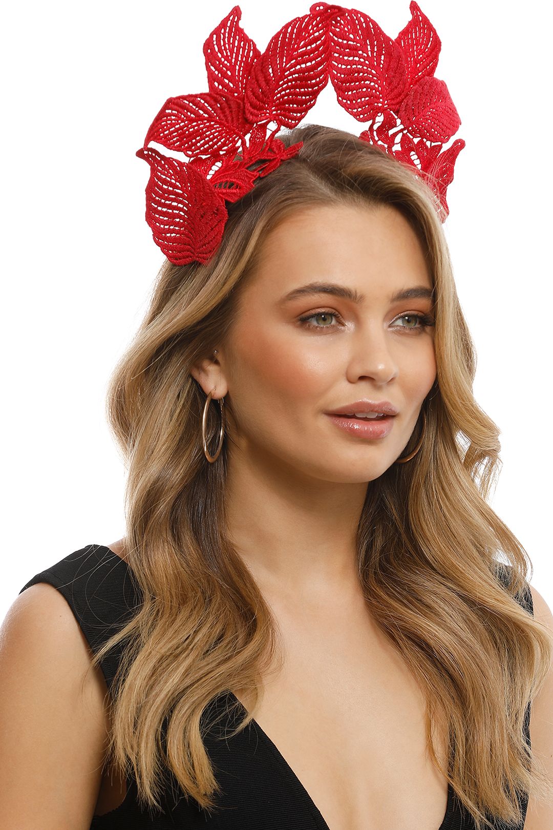 Hire this stand out piece by Morgan and Taylor and really turn heads at your next race day event or a spring wedding! Crafted out of red rigid lace, it features standing symmetric floral leaf patterns with cut out details for a flattering ethereal look. Finished on a satin headband, it's the perfect contrasting modern headpiece to rent for your next daytime formal function or birthday bash!