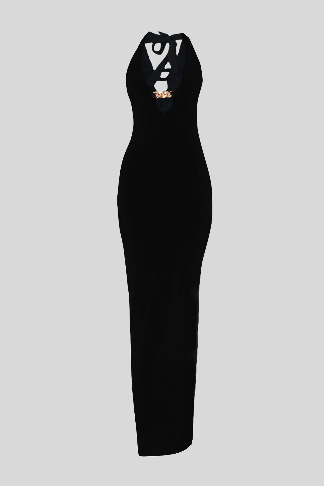 Demonstrate elegance and femininity with the striking Alyssa Black Chain Gown! This plunging dress is made from the characteristic gentle jersey fabric and showcases a gold chain embellishment at the front as well as a low back, along with halter ties.