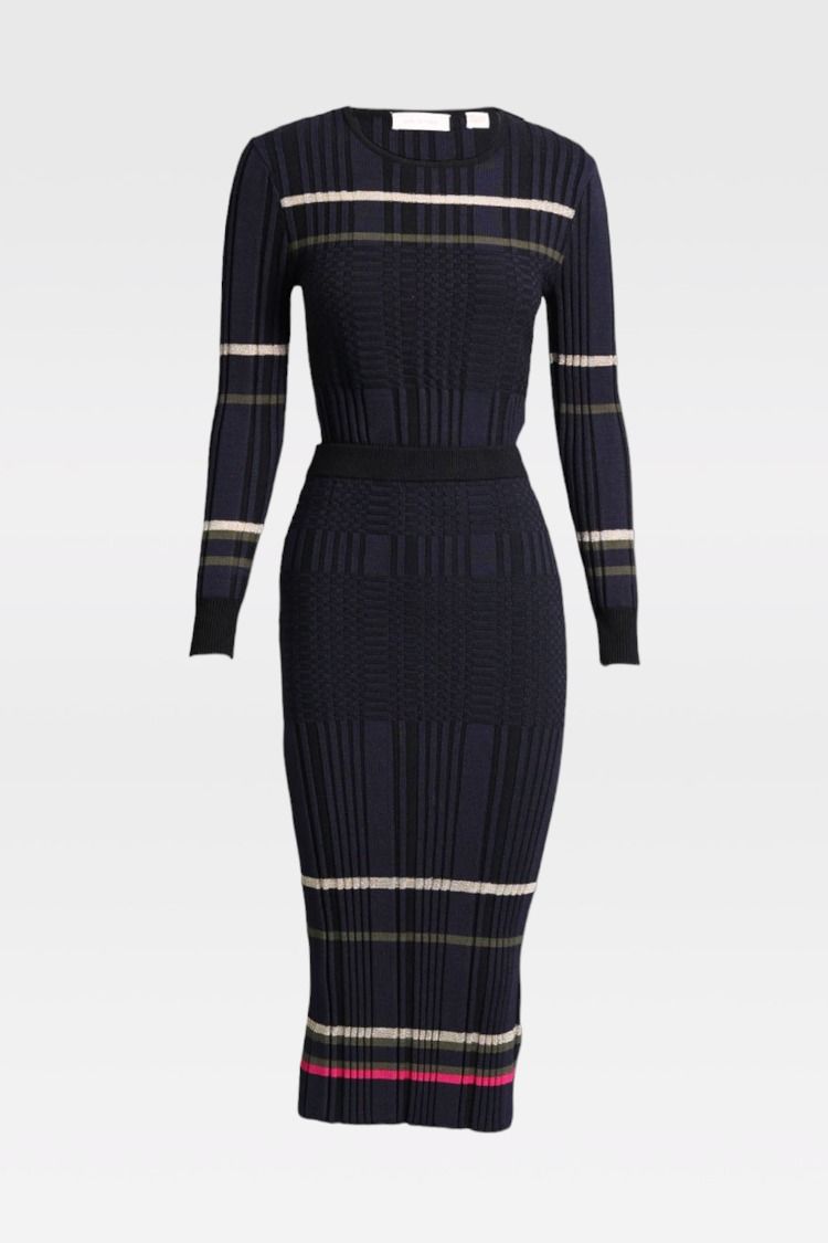 The Sass and Bide Navy Blue Slave to Love Set is a stylish and comfortable ensemble. It's made from luxurious knit fabric, providing both coziness and structure. The timeless pencil skirt pairs well with the long-sleeved crew neckline top to create a harmonious and elegant look.