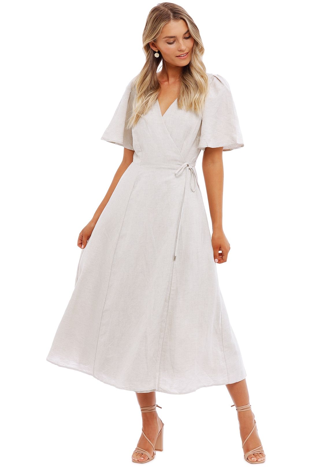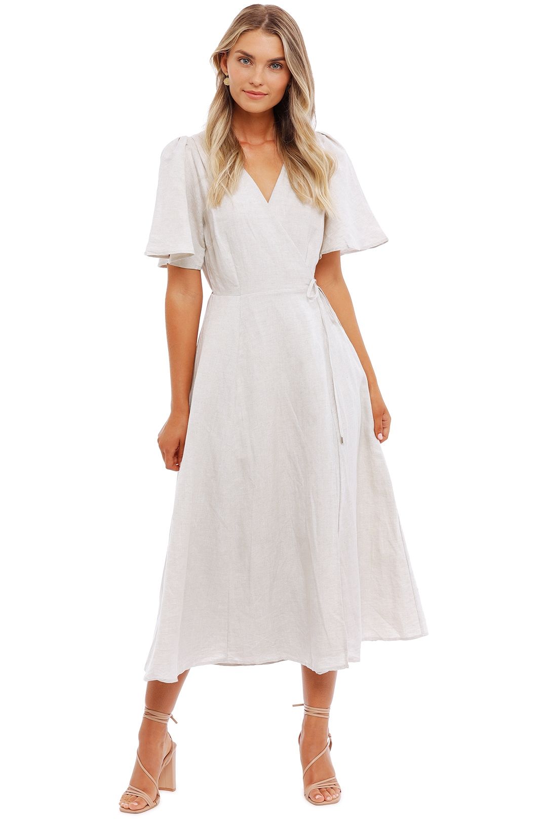 Want the perfect casual brunch look? Try the Amaya Wrap Midi Dress in Cream by Staple The Label. This chic midi dress features a v neckline, short flutter sleeves, and a flattering A-line skirt. With a classic wrap silhouette, this dress is perfect to hire for a brunch.